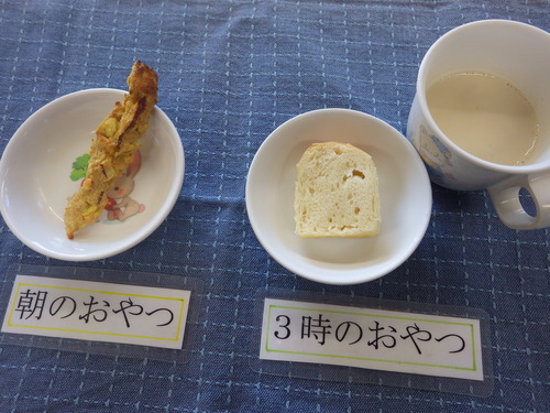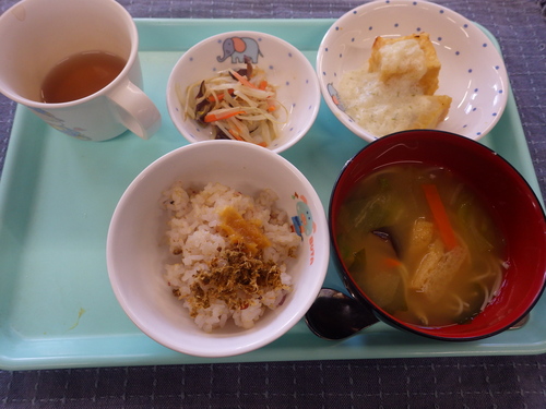 本日のメニューは・・・ 朝のおやつが、がね焼き。 お昼のご飯が、 雑穀一分づきご飯 豆腐の甘辛ダレ、タルタルがけ ごぼうさらだ 小魚入りそうめんみそ汁。 3時のおやつが、手作りパン・豆乳きな粉。