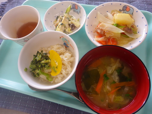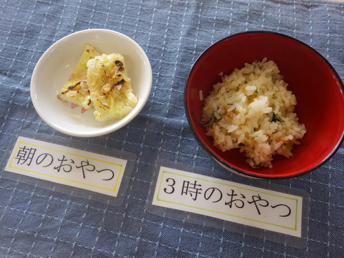 本日のメニューは・・・ 朝のおやつが、きゃべつおやき。 お昼のご飯が、 もちあわ一分づきご飯 肉じゃが アスパラ米ぬか白和え 春きゃべつのみそ汁。 3時のおやつが、シイラと青菜のチャーハン。 離乳食お休みです。