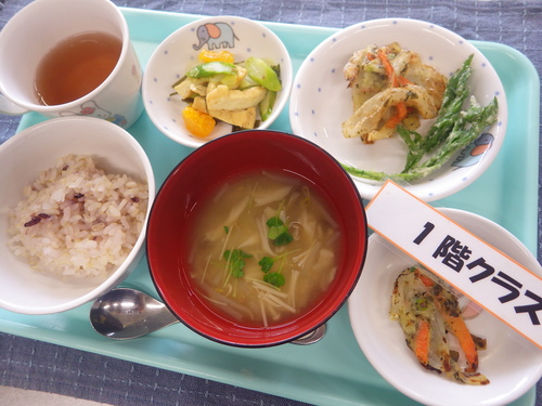爽やかなかき揚げで子どもたちも進んでいました。畑のよもぎも添えています(^^♪
